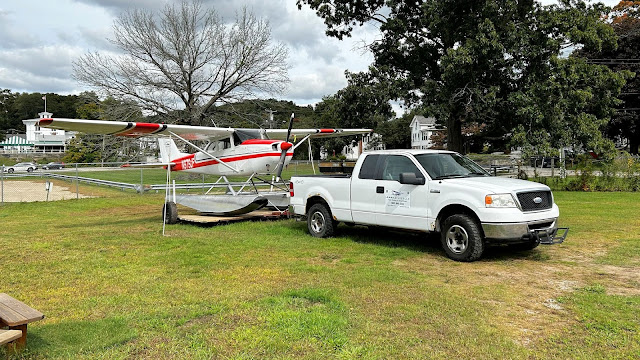 Learn2Fly LLC bases a Cessna 172 on straight floats (above) and a J3 Cub (not observed) at Goodspeed for seaplane training. Non amphibious, the Cessna needs to be backed down the ramp into the river. When Tom and I returned to the airport after exploring East Haddam, we encountered a stymied flight student and an embarrassed flight instructor frantically looking for the truck keys.